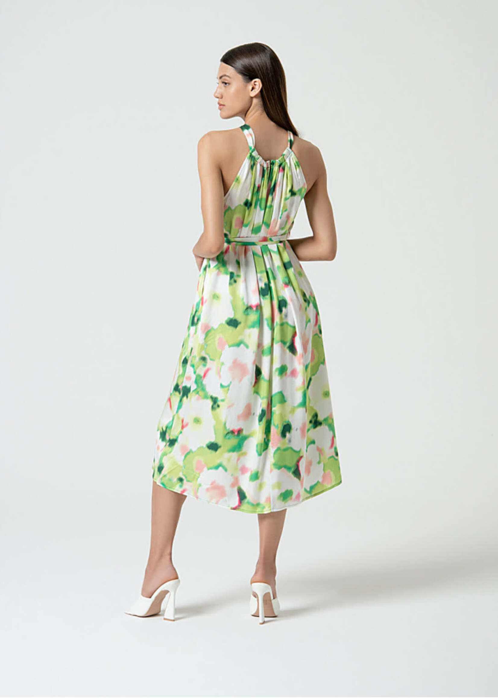 Satin halter-neck midi dress. Printed belt included. Soft, flowy fabric.