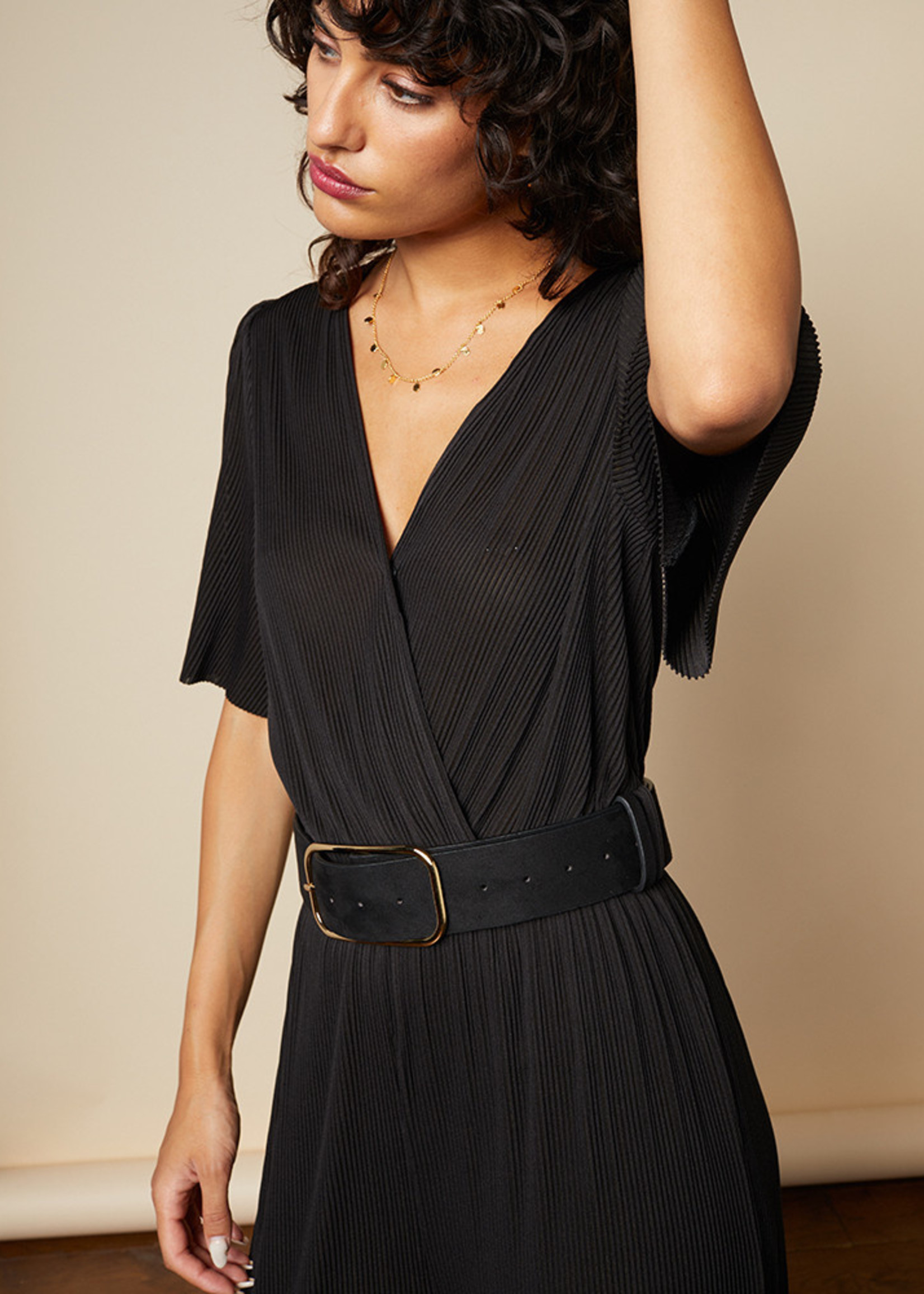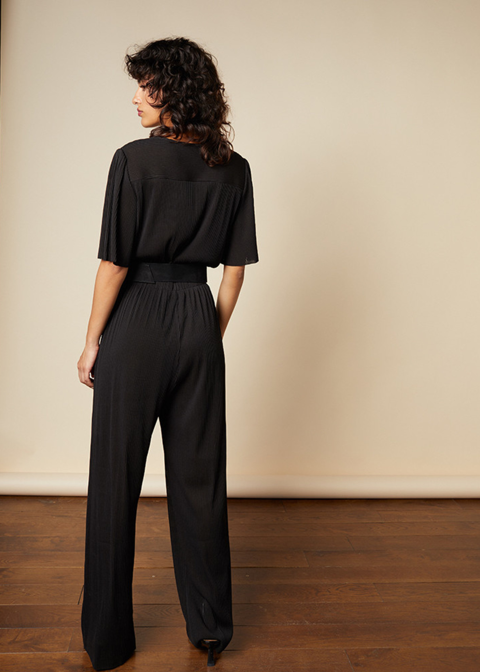 Une belle combinaison pantalon qui allonge la jambe et dessine la silhouette. On aime le détail de l'encolure qui se croise sur le devant et les manches papillon qui apportent de la fluidité à la tenue. L'allure est glamour et chic.