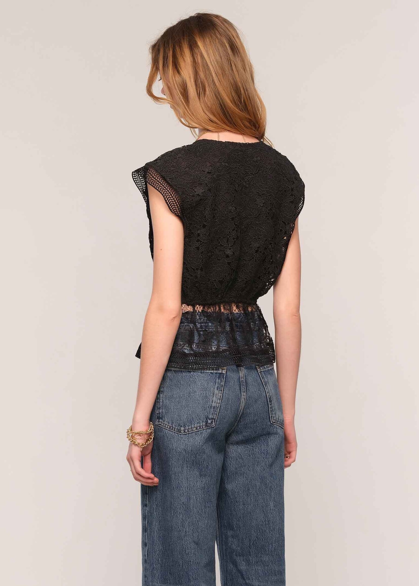 Le haut Gianna est confectionné en dentelle florale fine et bordée de dentelle. Il présente un col ras du cou, des épaules tombantes et une coupe slim. Ce chemisier délicat est parfait avec un jean vintage et des talons à lanières.