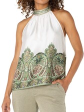 Affirmez votre style avec notre haut licou à superpositions, offrant un look élégant et sophistiqué. Présentant des détails féminins dans un magnifique imprimé cachemire, ce haut est parfait pour le brunch ou les occasions spéciales.