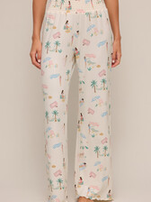 Disponible dans un tissu en jersey soyeux ultra-doux avec un imprimé plage sur toute la surface, ce pantalon fait passer le confort au niveau supérieur. Avec sa taille à smocks, sa coupe facile et sa coupe droite, parfait pour se détendre toute la journée